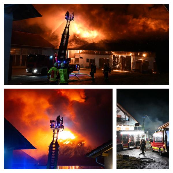 Großbrand fordert Feuerwehren stundenlang, Stallung brennt komplett nieder, hoher Sachschaden und tote Tiere, Brandhof, Gmd. Schalkham, Lkr. Landshut, 08.12.2025 ca. 17.15 Uhr